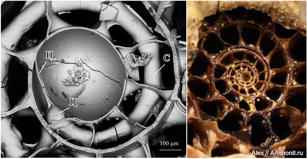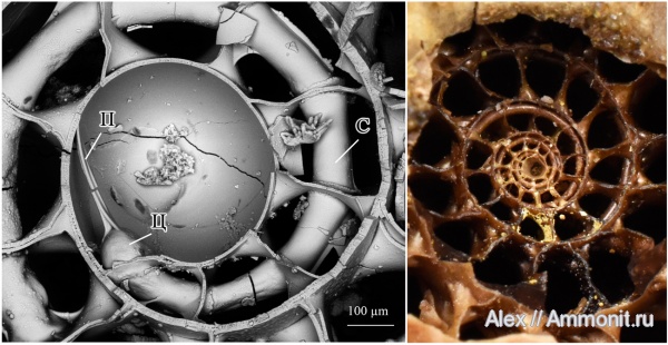 На этом фото я решил показать, как выглядит сифон на первых оборотах наших юрских аммонитов. Это раковина Craspedites nekrassovi из волжского яруса верхней юры с р.Черемухи. Волжские аммониты очень удобны для изучения строения их фрагмоконов, потому что они не пиритизированы и часто не заполнены породой. Рассыпавшаяся стенка раковины в пупке аммонита (часто явление при извлечении из конкреций) портит его как коллекционный образец, зато позволяет увидеть детали его внутреннего строения. Левое фото я сделал на электронном микроскопе в Палеонтологическом институте, правое - при помощи фотоаппарата с макрообъективом. Аммонит вскрылся "сам" (при расколе конкреции), я только немного дочистил его иголочкой под бинокуляром.