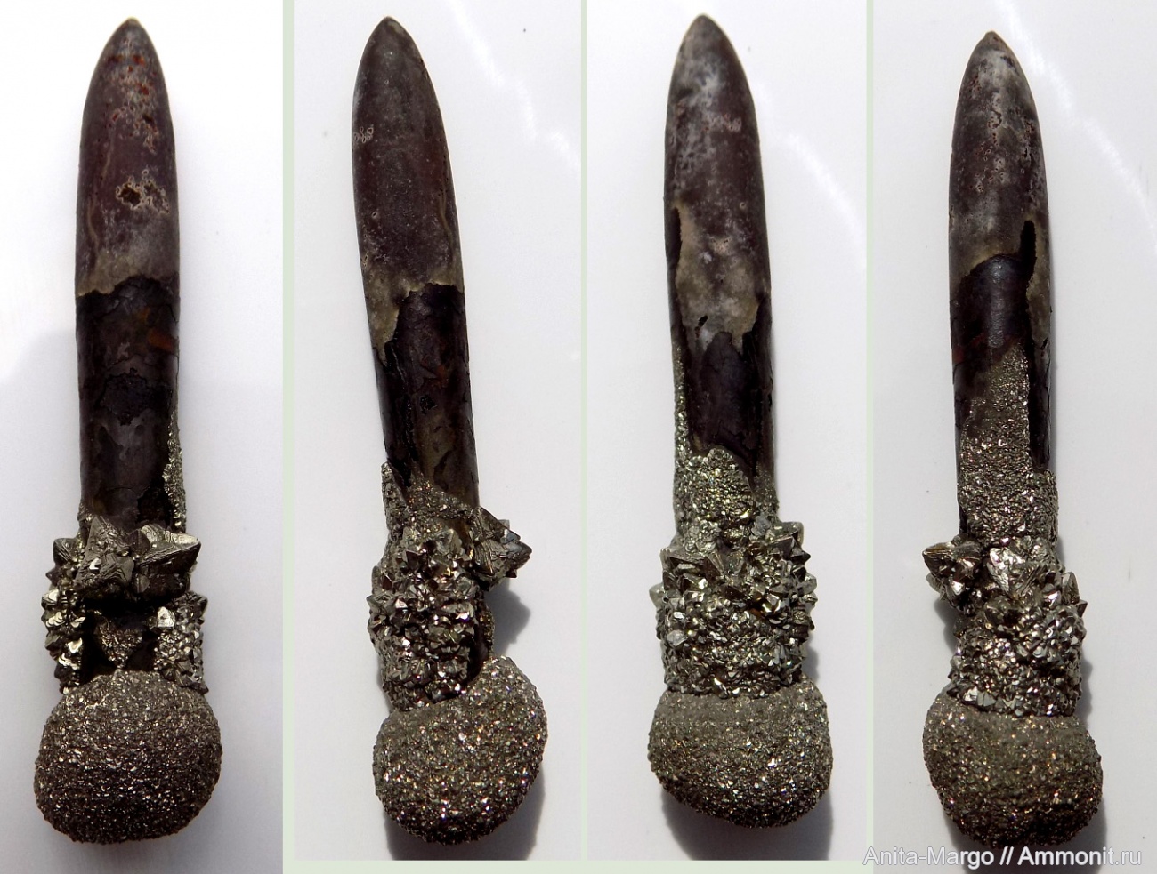 Красиво конечно, прямо палеонтологический скипетр )) У нас вот аммониты пиритизированные в келловее-оксфорде, бывает что жилые камеры облеплены пиритом, а вот на белемнитах пирита почему-то почти не бывает. | ||||||