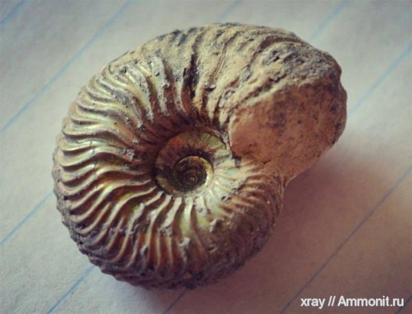 Вот такой 3-х сантиметровый Cardioceras sp. замещением из белого мергеля, покрытый тонкой коркой пирита был найден во время совместной поездки на михайловские карьеры.