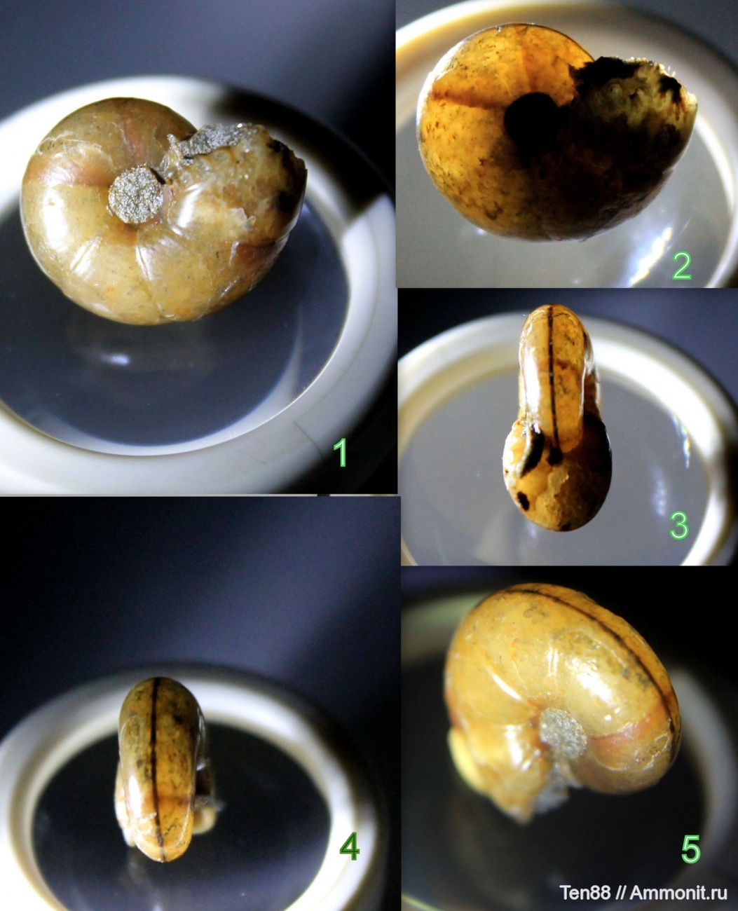 Небольшой, 1,8 см., кальцитовый аммонит. Фото 1- он при обычном освещении, 2 -он же на просвет, 3-5 - он же, но с хорошо видимым сифоном.