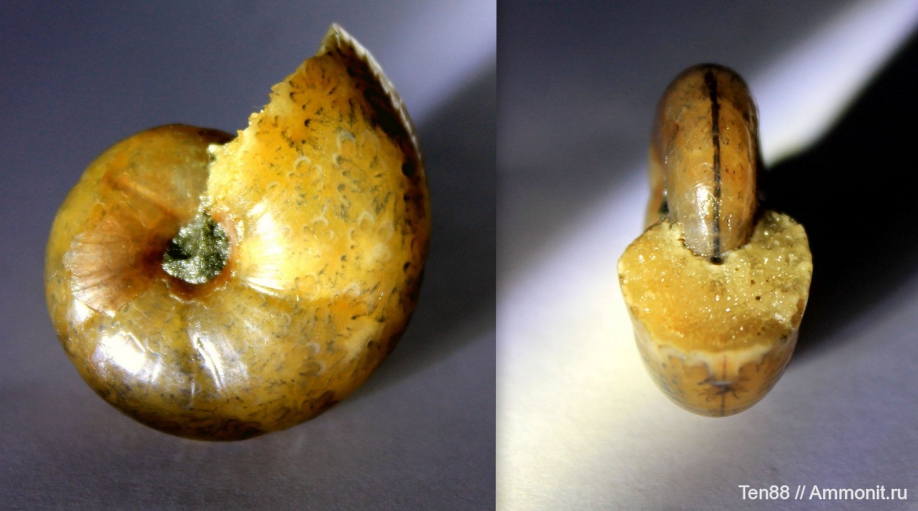 Этот аммонит-леденечик (карамелька и т.д. :)) размером 2,6 см. Это он с другой стороны и при другом освещении фото и тогда хорошо видны едва заметные пережимы. Ну, а тут я увлеклась фотографированием его лопастных красивых линий, да так, что не знала даже какое фото выложить :))), вот и сделала такой коллаж фото этого медового красавца :)