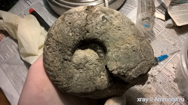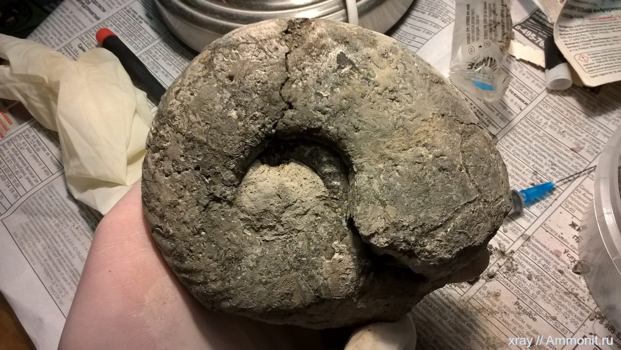 Аммонит Quenstedtoceras Lamberti верхний келловей,зона Lamberti.Этот здоровяк торчал из стенки на высоте примерно 2.5 метров, пришлось вырубать ступеньки в глине и вспоминать навыки скалолазания.Аммонит был аккуратно опкопан ножиком и вынут из стенки, меры предосторожности оказались не лишними так как данный экземпляр так и норовил рассыпаться на фрагменты камер. Дома потчивание клеем секунда устранило данный казус.
