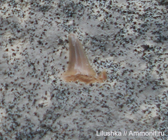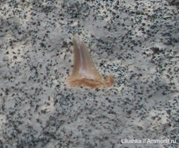 Зубик. Первый достаточно большой, чтобы видно было невооруженным взглядом. И неожиданно найден в мелу Саратова, откуда и устрицы. Высота 7 мм. Корешок трухлявый. Если бы не эмаль, и коронка рассыпалась бы, подозреваю, что внутри тоже трухля. Поэтому не трогаю его.