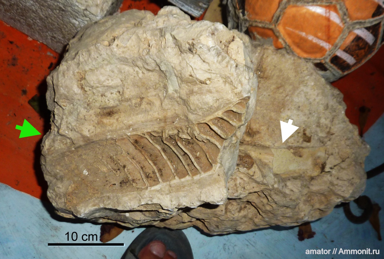 Камень обнаружен в сарае на греческом острове Закинтос (Закинф) в поселке Пигадакия. Вероятно какой-то головоногий. Буду благодарен за определение. В том же камне присутствует еще один объект (фото), который, похоже, пронизывает камень насквозь (белая/зеленая стрелки). Конкретно в том месте - Миоцен. Но вообще на острове есть и Плиоцен и немного Триаса. Где конкретно камушек был найден выяснить не удалось.