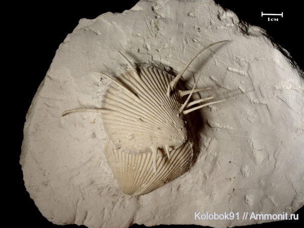 Очередной гребешок. Длина раковины около 4.5 см, длина самого длинного шипа около 4 см. Пожалуй самый большой шип, который мне попадался. К сожалению мелкие верхние шипы были сильно растворены, а боковые с левой стороны, обломаны в древности.