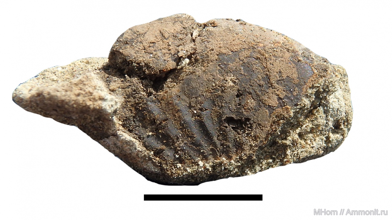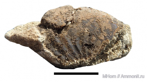 Этот небольшой обломок аммонита был найден в самых низах рязанского яруса (в средней части слоя М24) разреза Марьевка в июне 2016го года. Раньше нам в этом слое вообще аммонитов не попадалось, а вот теперь нашёлся вот такой образец