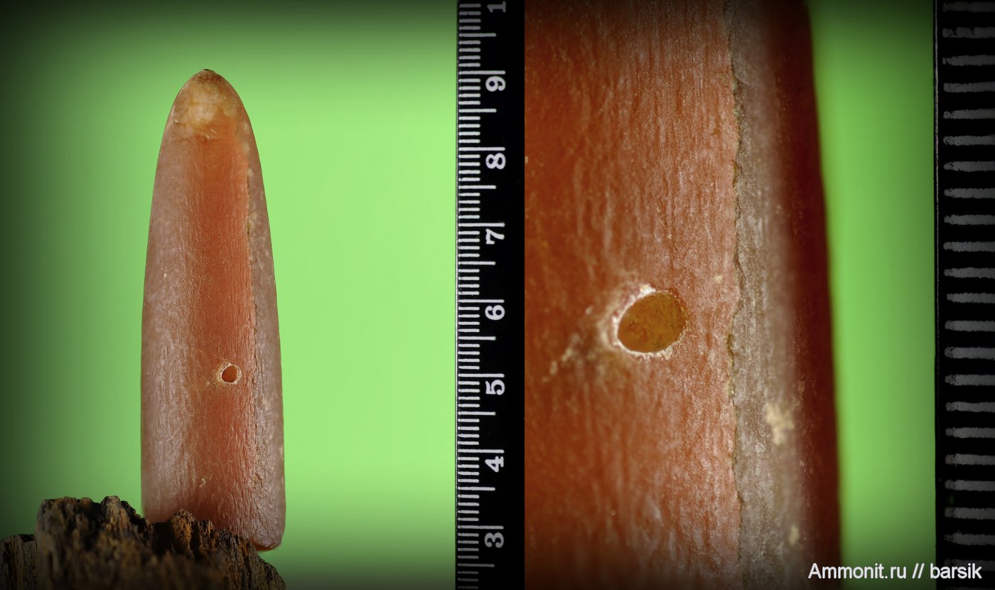 Этот ростр найден в Ростовской области р. Мал. Калитвенец, в породах, напоминающих обыкновенный мел. Отверстие глубиной 3-4ммм.
