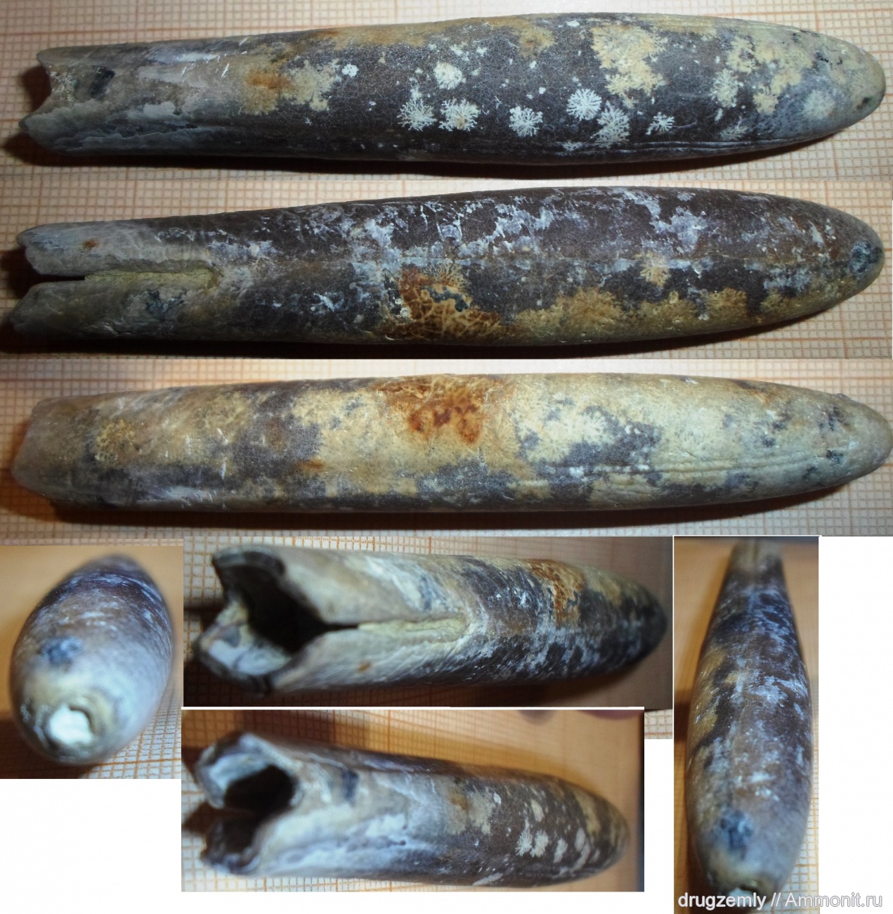 Мой первый белемнит такой сохранности. видны хорошо артериальные борозды. Следы сверления Rogerella
