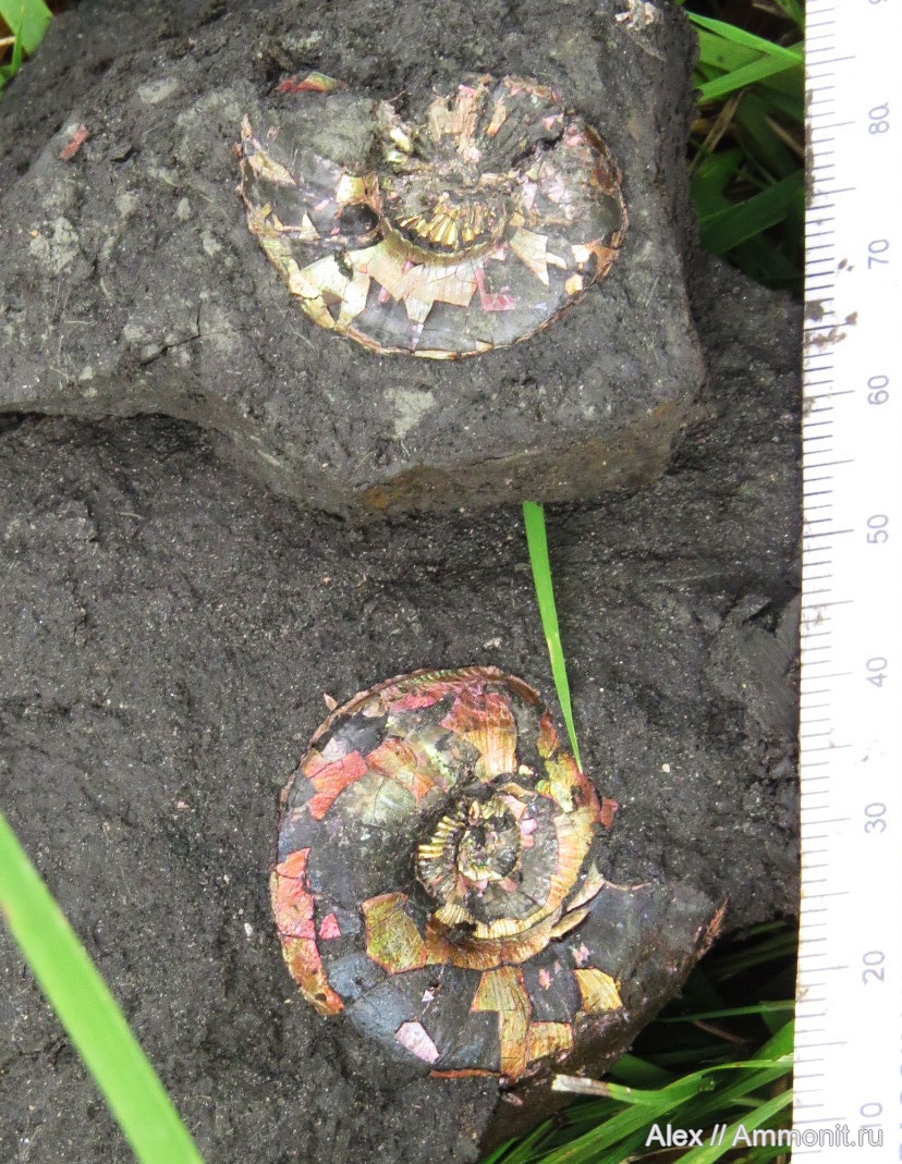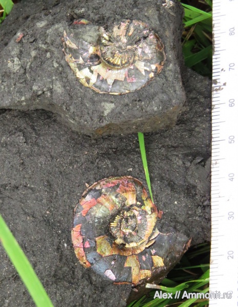 Пара Amoeboceras lineatum их нижнекимериджских глин у д.Болгары. Этот вид отличается гладкой жилой камерой, причем центральные обороты этих аммонитов грубо-ребристые, а ребра могут исчезать как на расстоянии половины оборота от устья, так и за целый оборот. Это видно на фото - у верхнего аммонита гладкая стадия короче, чем у нижнего.