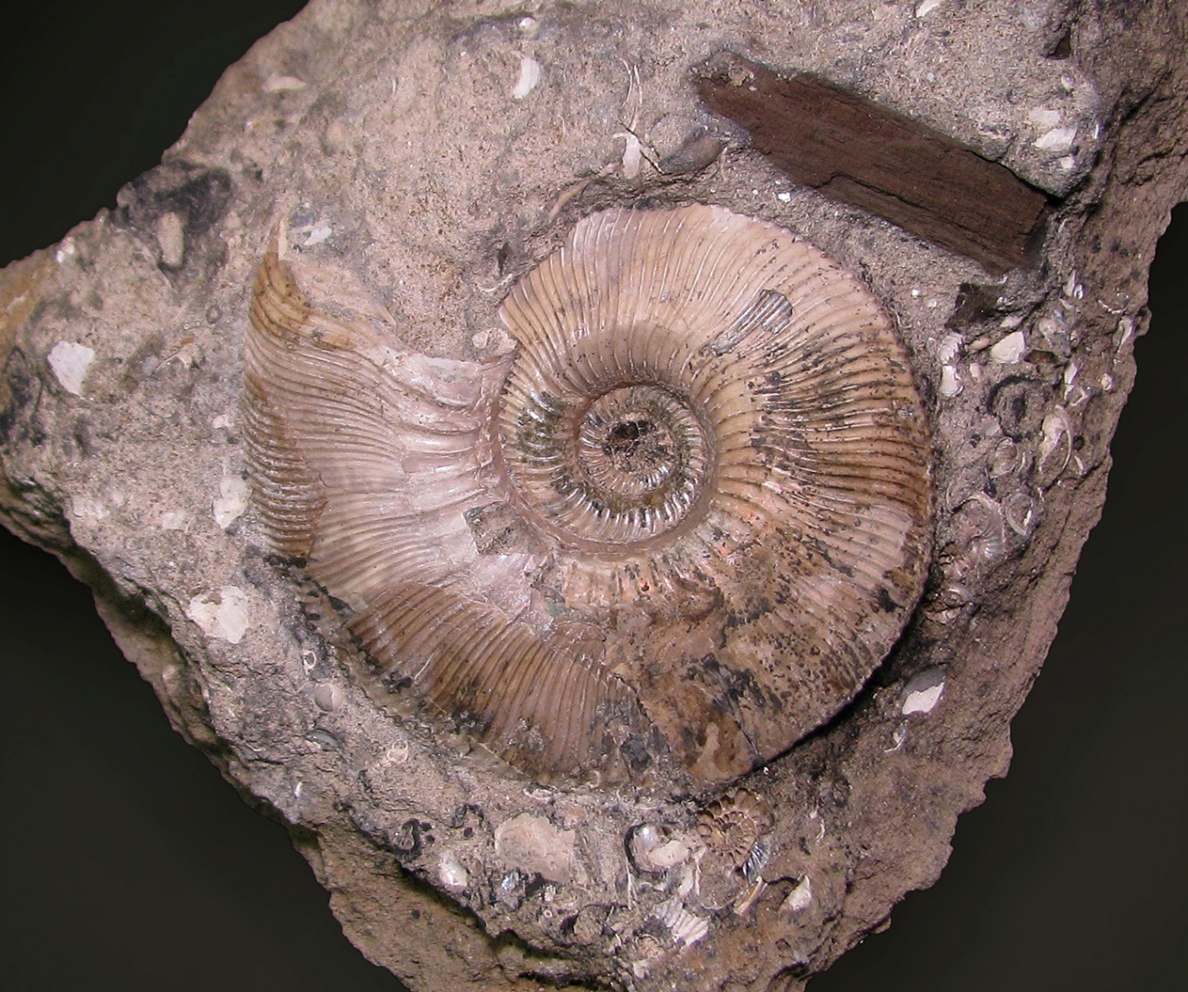 Аммонит размером 6.5 см из песчано-фосфоритовой конкреции с многочисленными остатками других аммонитов, брахиопод, гастропод и фрагментов древесины.