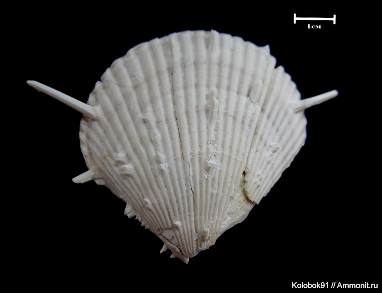 Данный образец был найден в меловой осыпи. Удалось собрать почти целую створку и несколько шипов.Длина раковины 5 см.