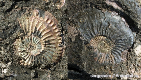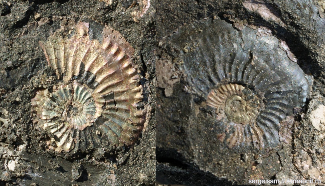Для полноты картины по нижнекимериджским аммонитам из Болгар, решил выставить фотографии двух аммонитов из слоя с аммонитами Amoeboceras zieteni (самый нижний слой у воды, в прошедшие выходные он был недоступен, из-за того, что уровень воды поднялся на 20 см). Слева Amoeboceras sp. с большими вентро-латеральными бугорками, с гладким без зубчиков килем на жилой камере. Справа возможно Amoeboceras lineatum , т.к. на жилой камере рёбра сглажены, один оборот имеет обычную скульптуру и далее абсолютно гладкие обороты.