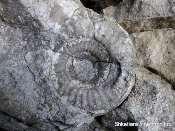 Во входной части одной из пещер Северного плато вдруг обнаружился аммонит. Я даже вначале не поверил, когда рассказали. «Аммонитами» и «наутилусами» наши спелеологи с легкостью называют поперечные срезы улиток, а настоящих аммонитов раньше на плато не находилось. Но оказался вполне настоящий. В довольно крупной глыбе.