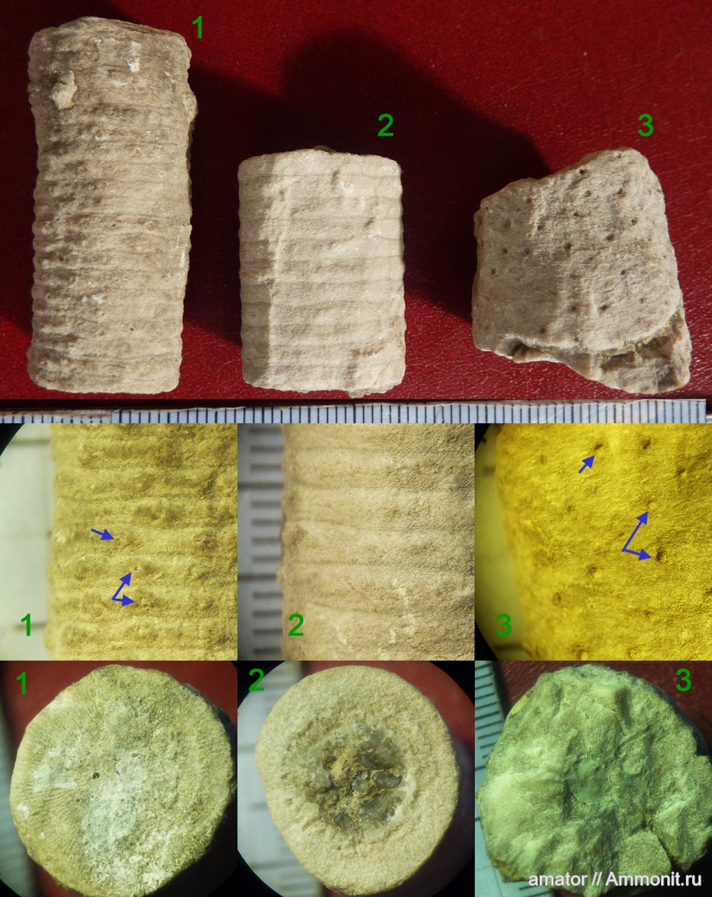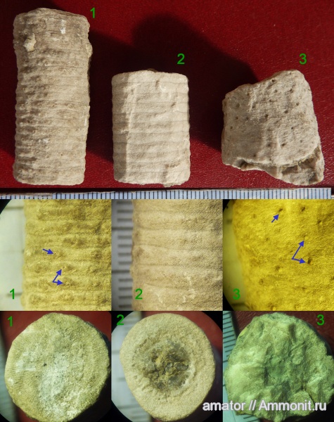 Наблюдается некоторая закономерность в расположении этих отверстий. Так, например, на швах сочленений фасеток их нет. На снимке 1 они даже выстроены в ряд. Может это какие-то органеллы криноидеи? Например, основания дополнительных отростков (цирри)? | ||||||