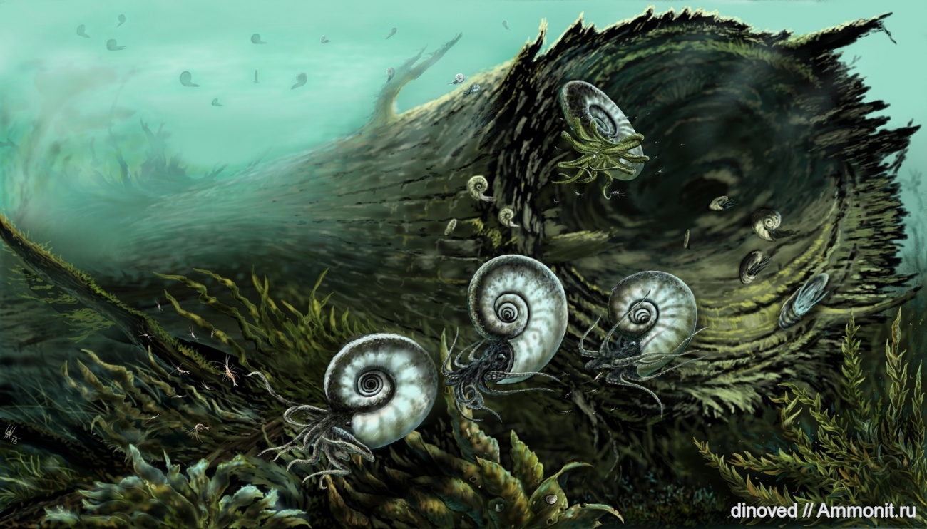 Небольшая стайка аммонитов вида Kachpurites cheremkhensis охотятся рядом с побережьем, среди морских водорослей и затонувших деревьев.