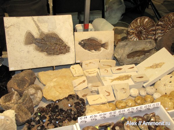 На этой фотографии с "Геммы" - американские отпечатки рыб, морские ежи, друза черного граната андрадита, слева - шишки араукарий из Аргентины (очень похожие на Araucaria elongata), внизу - мадагаскарские аммониты.