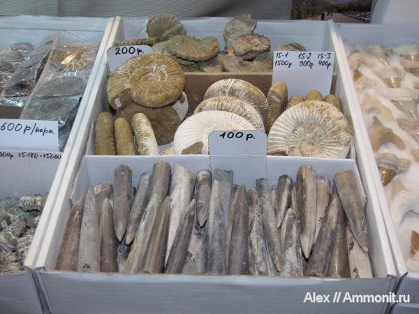 Вверху меловые аммониты из Казахстана, чуть ниже мадагаскарские Perisphinctidae, а уж на переднем плане - это без комментариев )) Правда, забыл спросить, пользуются ли белемниты спросом.