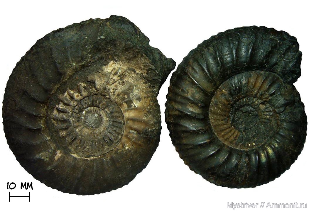 Справа - var. orbignyana (с более приподнятыми и грубыми ребрами на внешнем обороте и частой ребристостью на средних оборотах)