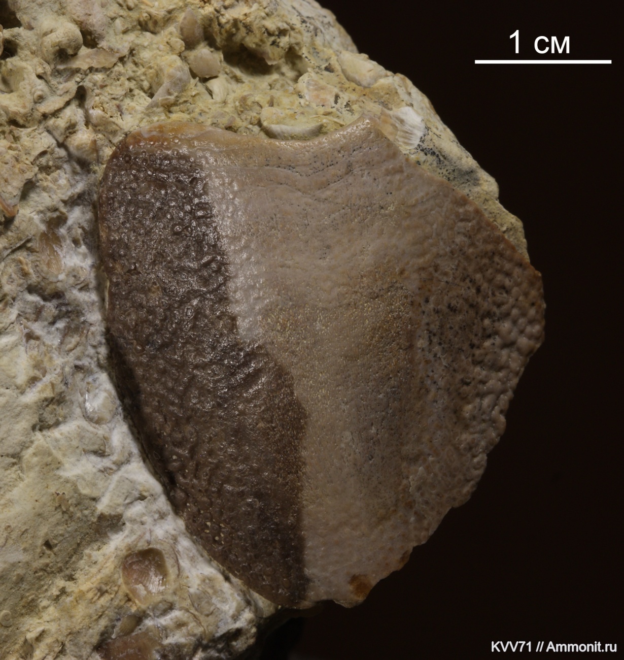 После расчистки от породы (темная сторона панциря) стало видно, что она на половину целая (вся левая боковая сторона и большая часть передней). В силу симметрии этой пластины, рыба вполне диагностируема. Нижняя часть на фото (ближняя к хвосту), заканчивается здесь обломанным, шипообразным выступом. На пластине с внутренней стороны есть киль, начинающийся чуть дальше от переднего края и хорошо видный с торца заднего.