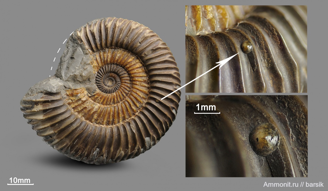 Да, видимо гастропода. Интересно, что все они такие маленькие, что помещаются между ребрами аммонитов. Может это был такой вид, адаптированный к жизни на паркинсониях? | ||||||