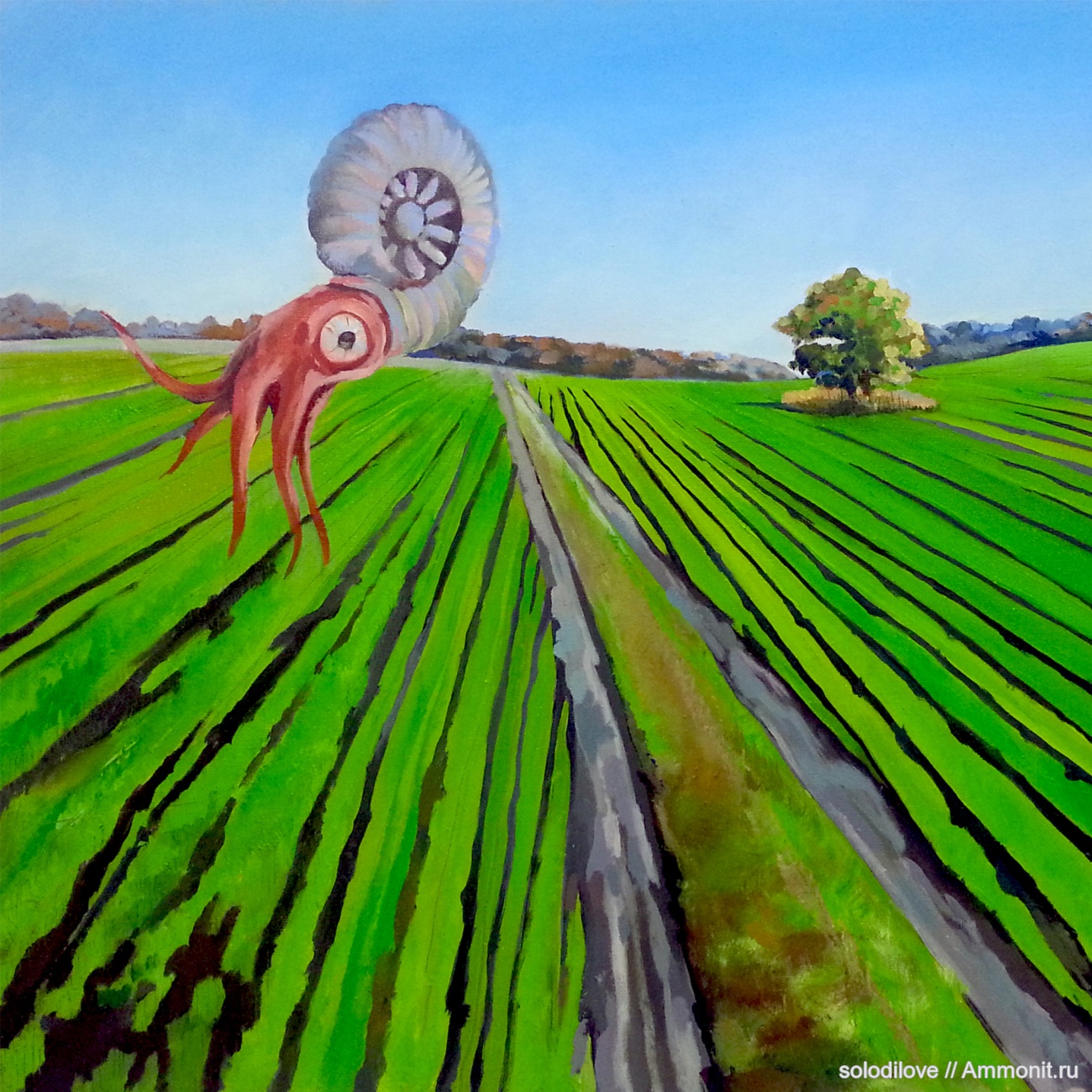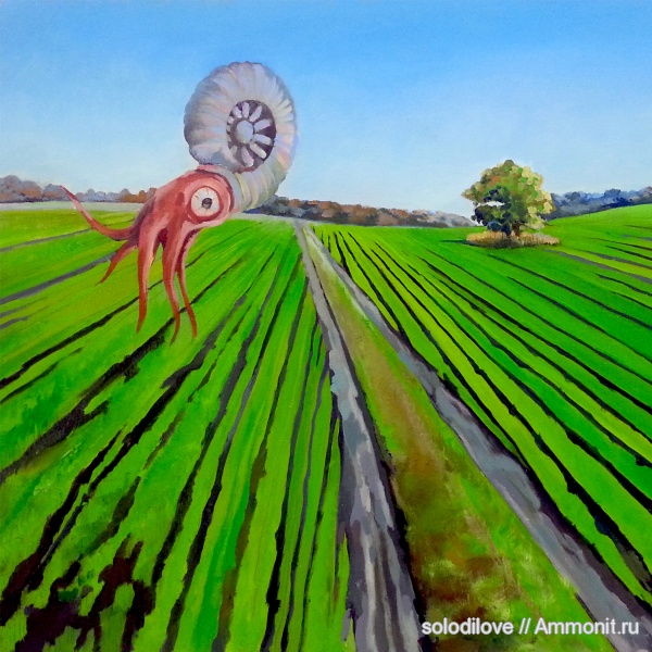 Картина в стиле сюрреализм с использованием мотива найденного аммонита в поле