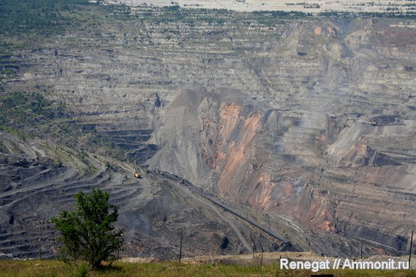 Самого дна здесь ещё не видно! Справа в нижнем углу, где можно рассмотреть маленькое изображение загрузки "белаза", начинается дорога, которая идёт в самый нижний горизонт, и уходит за бугор, ближе к оползню! Там отметка примерно -540 метров! | ||||||