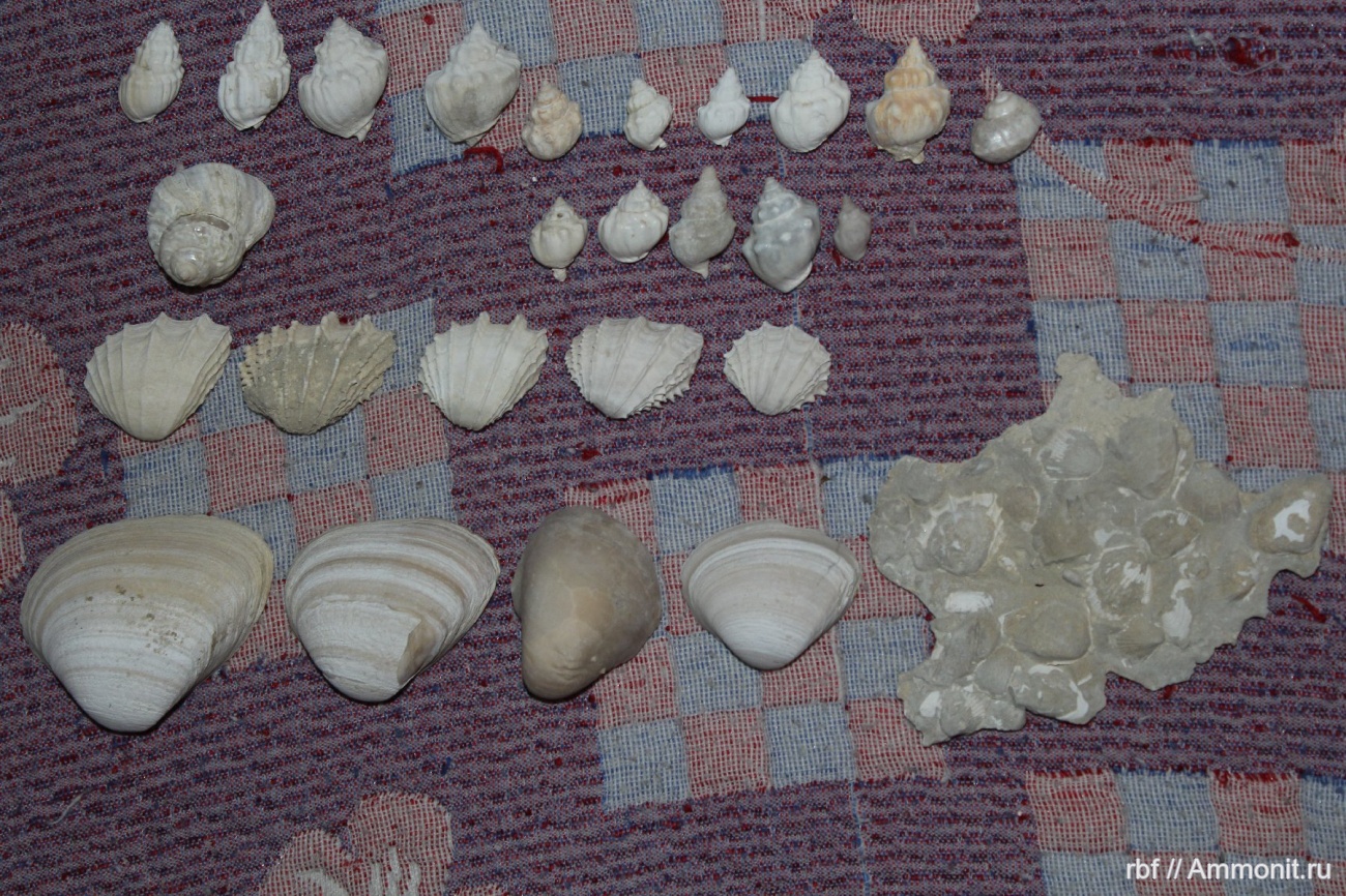 Два верхних ряда - виды Dorsanum с двумя раковинами Barbotella, третий ряд - Plicatiforma, нижний ряд - Mactra (кроме плитки).