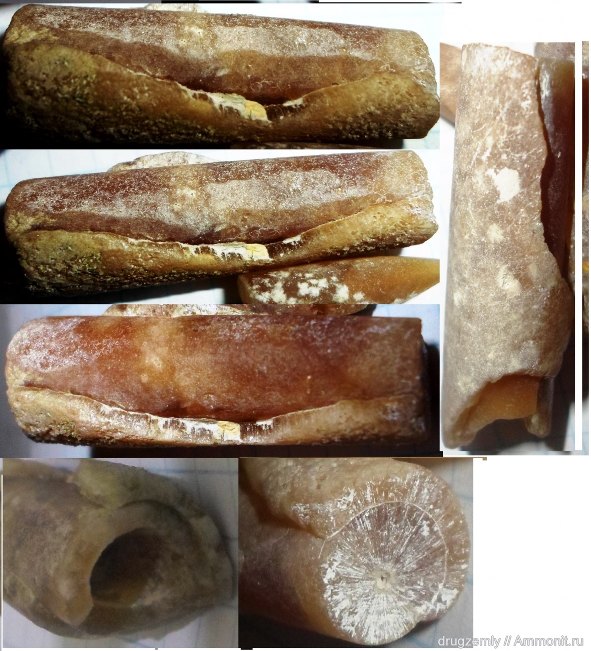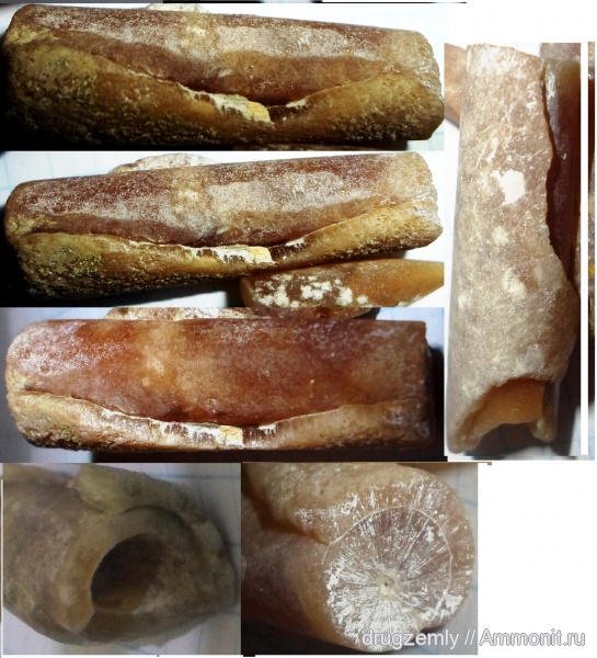 Ростр белемнита наращивался послойно. Т.е. на ростр, как чулок нарастал следующий слой, потом следующий и т.д. Они называются чехлики нарастания. Каждый слой контактировал с мантией и естественно на нем отпечатывался рисунок мягкой ткани. Он зарастал следующим чехликом, но рисунок сохранялся. | ||||||