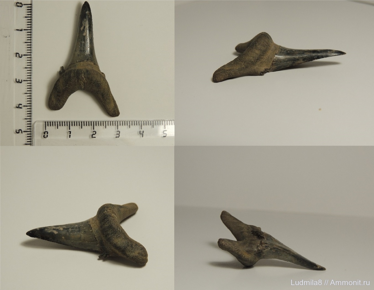 Зубы, найденные в реке, все имеют черный или темно-серый окрас. Но, всё-равно, сохранились хорошо. Этот, один из самых, крупных найденных в этом году. С одной стороны 2 вспомогательных зубца сохранились хорошо, с другой, отломлены. Принадлежал акуле рода Jaekelotodus.