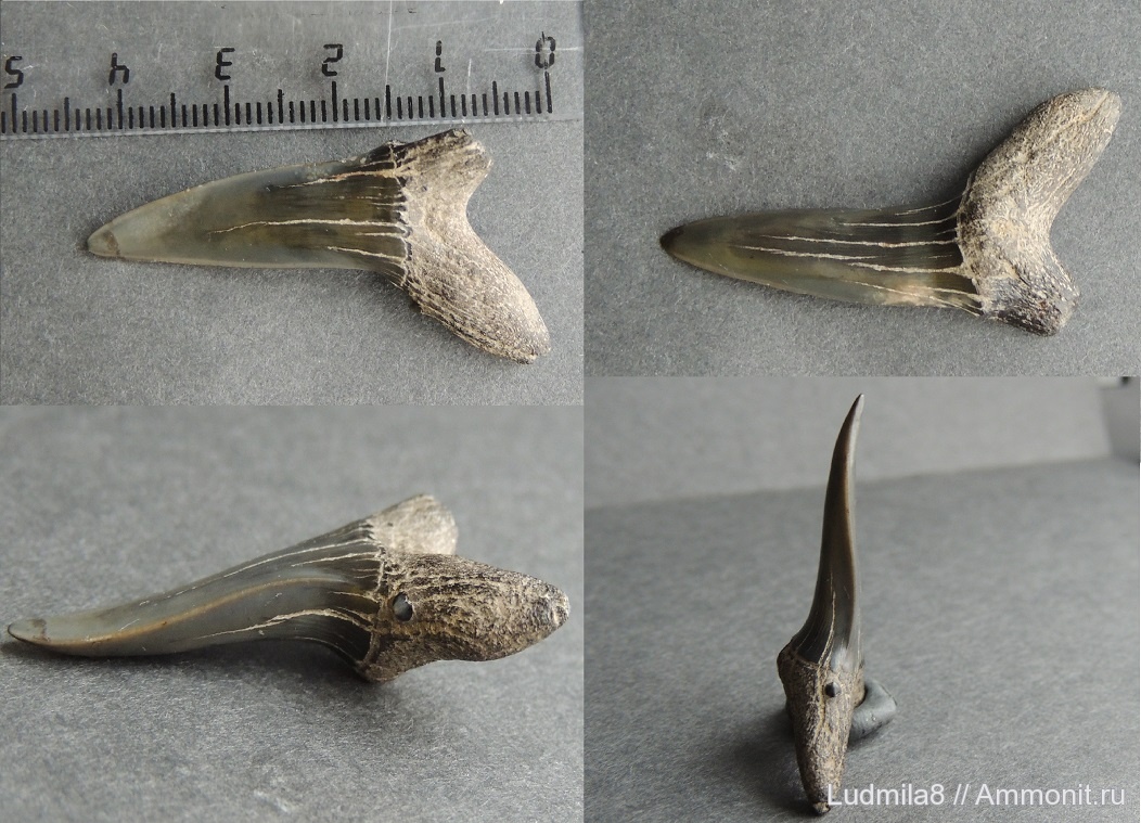 Сломана часть корня. Зато крупный, увесистый. Было питательное отверстие, сохранился 1 вспомогательный зубчик.