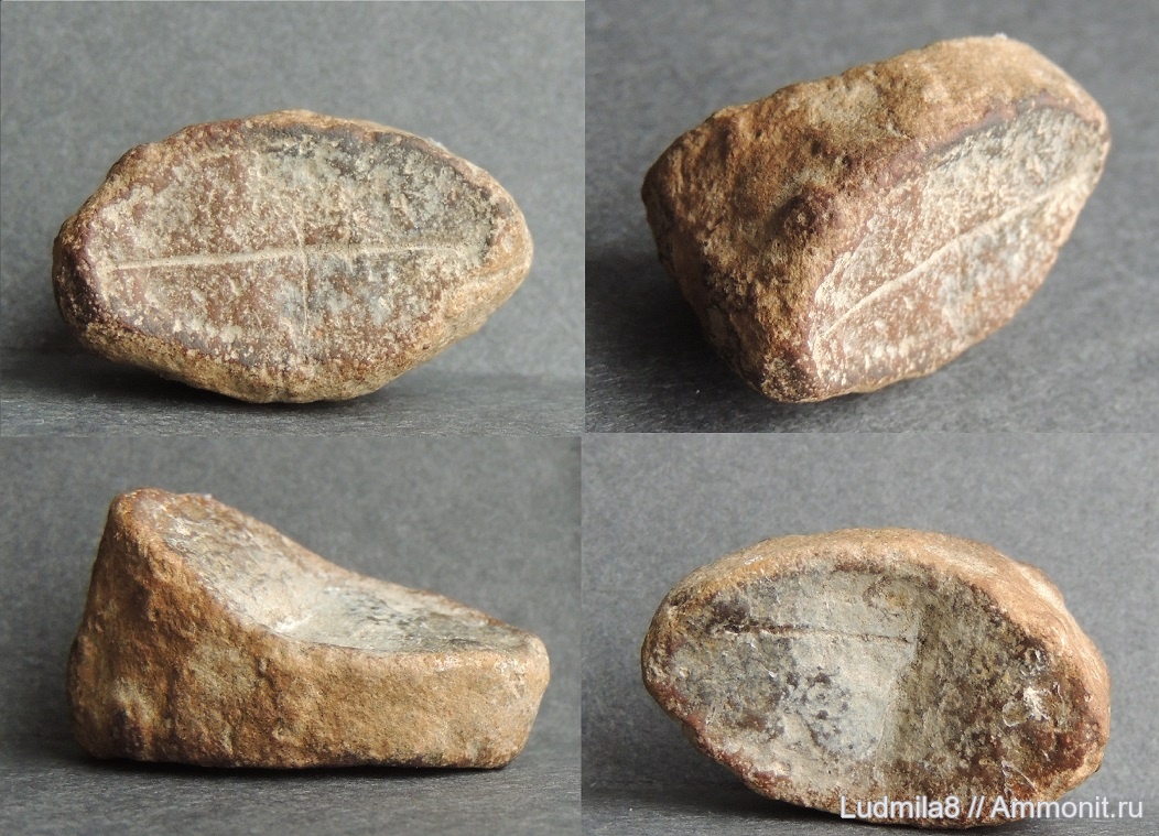 Размеры: длина 3 см; толщина широкой части 1,5 см; ширина 1,5 см. Интересная продольная полоска, разделяет образец на 2 симметричные части, есть еще и поперечная, ее видно хуже, образуют как бы крестик на поверхности. Что это может быть? Пишите, пожалуйста, предположения. Есть еще нечто похожее, размером крупнее.