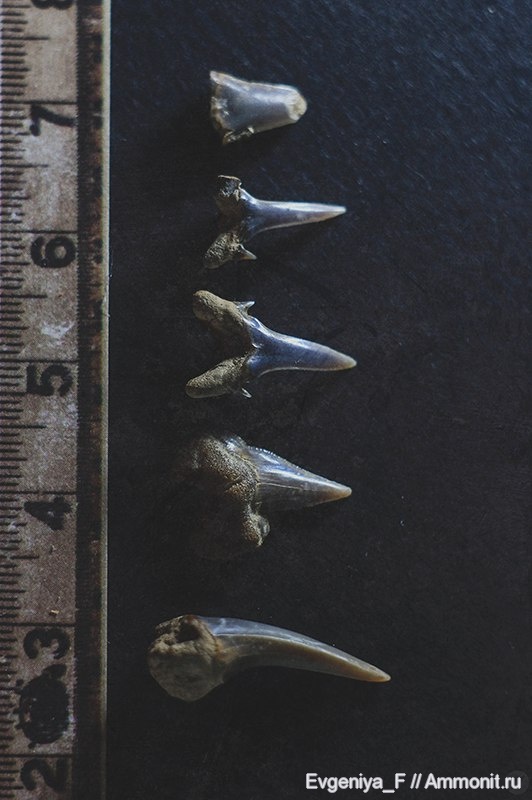 Сверху вниз Lamniformes indet., ?Carcharias cf. gracilis x2, Pseudocorax cf. affinis, Lamniformes indet. Очень интересно, похоже маастрихт, на ВЕП не так много местонахождений акульих зубов этого возраста. | ||||||