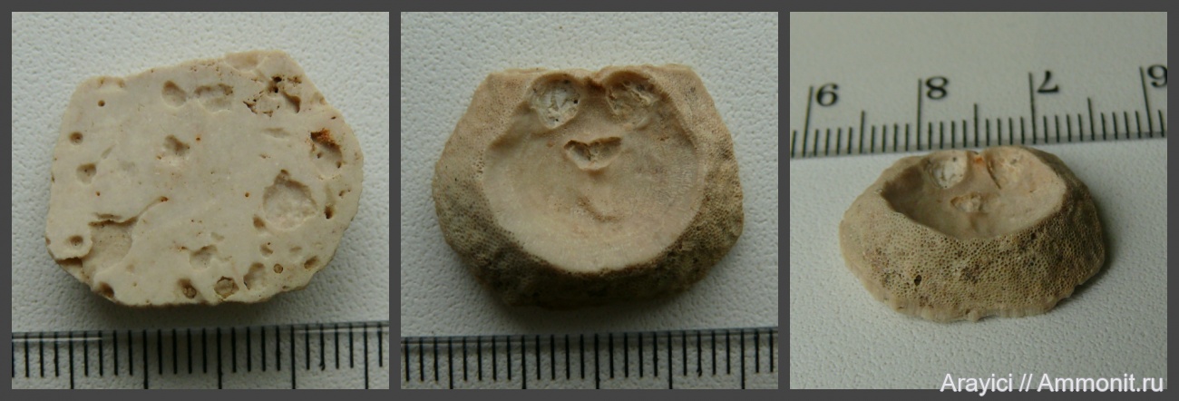 Скрытая сторона является собственно площадкой крепления к субстрату. Расчистка с этой стороны не нужна, сняв слой раковины или что там "прилипло" вы увидите систему пор, через которые продавливалась цементирующая секреция.Так что эта сторона не несёт никакой особо важной диагностической информации. Вообще это достаточно хрупкие вещи (по крайней мере у нас в регионе), поэтому нужно поосторожней с ними) | ||||||