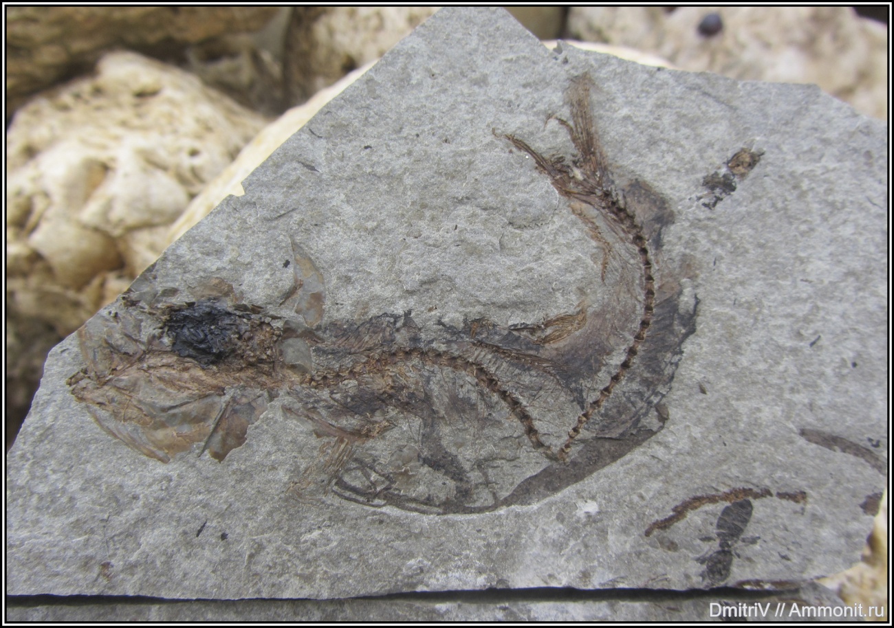 При разборе оставшихся после обрезки и препарации плит с последней поездки на р. Пшеху раскололи один из камней. К нашей радости, там оказалась рыба, а в нижнем правом углу — насекомое с частично сохранившимися лапками.