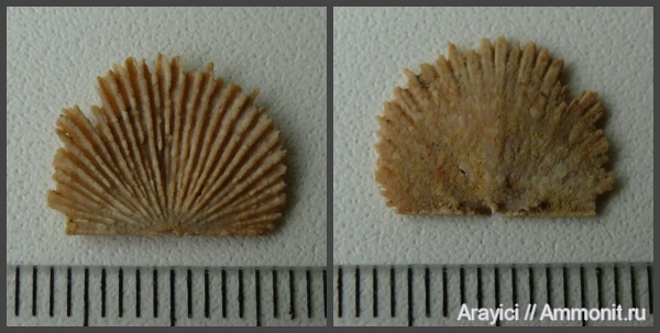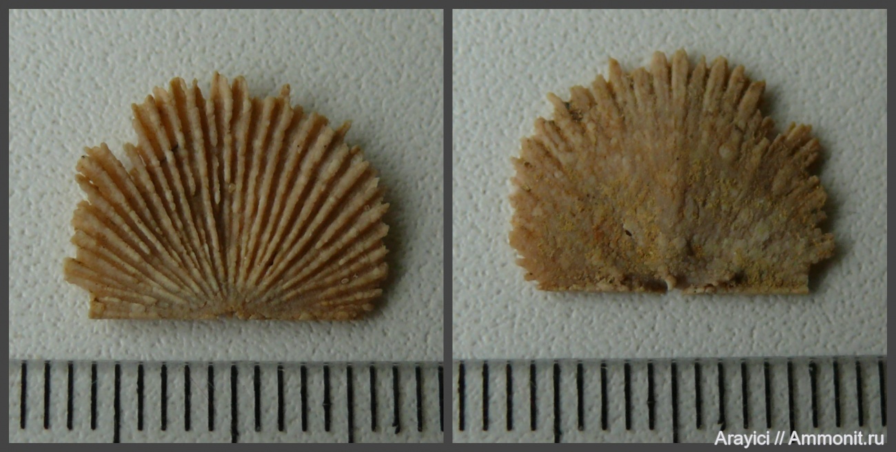 Если честно, то сильно напоминает какую-нибудь силуро-ордовикскую Orthidae.. Характер рёбер (дихотомия с интеркаляцией); несколько сглаженные (из-за окремнения?) элементы внутреннего строения спинной створки, с характерными срединной септой, зубными ямками, брахиофорными пластинами также указывают на принадлежность к семейству Orthidae Woodward, 1852. Из меловых брахиопод я что-то не припомню с подобной морфологией.. | ||||||