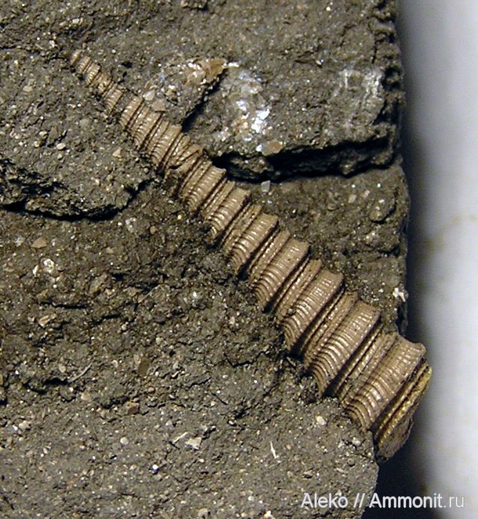 Раковина гастроподы Clathrobaculus krantzi из оксфордских отложений, Новоселки Рязанской обл. Справа вверху около раковины виден отпечаток мелкого оксфордского аммонита. Как правило, в этих слоях встречаются только такие крошечные отпечатки и рассыпающиеся глиняные слепки ювенильных(?) особей неопределимых аммонитов.
