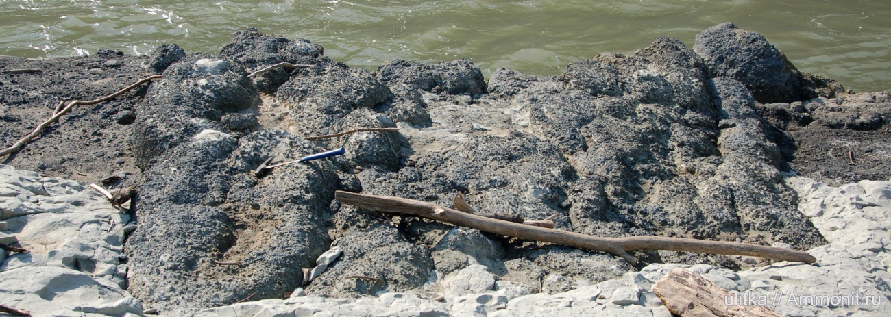 Небольшой массив органогенных построек (посередине) по флангам окруженный "окнами", отделяющими его от соседних аналогичных массивов. "Окна" сложены разнозернистой обломочной породой (смесь от пелита до гравия), переполненной ракушей, и усыпанной по поверхности остроугольными обломками - результатом разрушения окружающих органогенных построек.