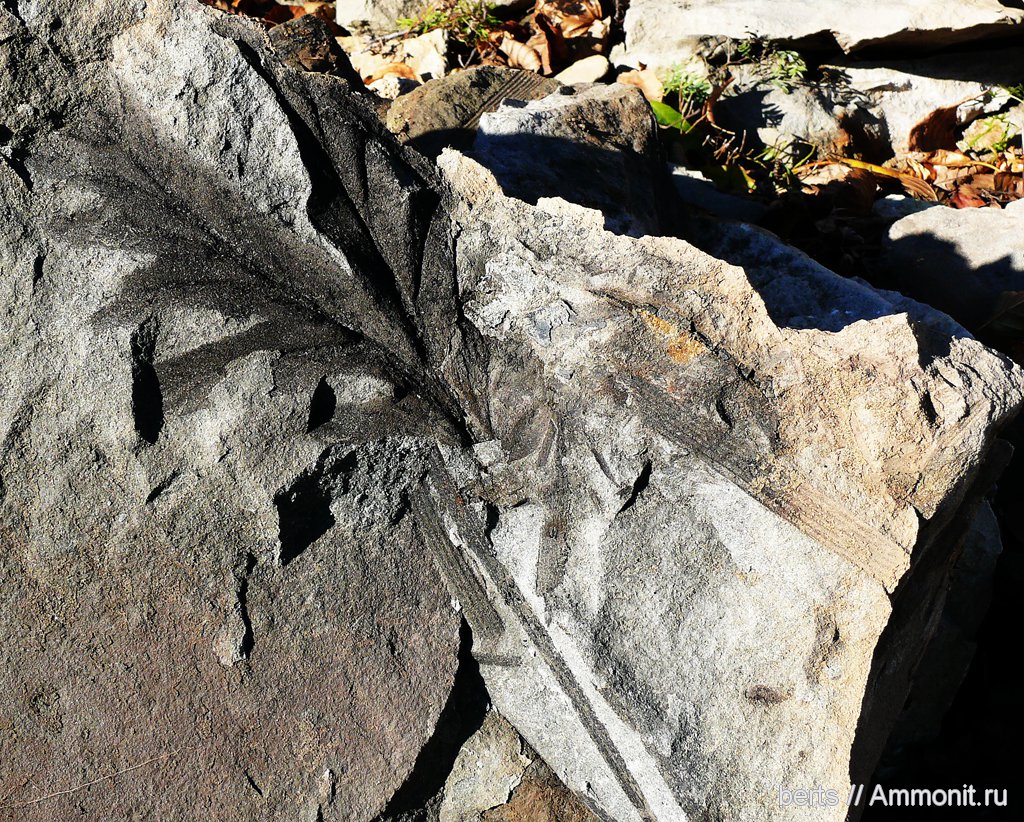 Обугленный отпечаток листа папоротника в песчанике. Видны стебли хвощевидных. В этих же песчаниках находим отпечатки листьев кордаитов.