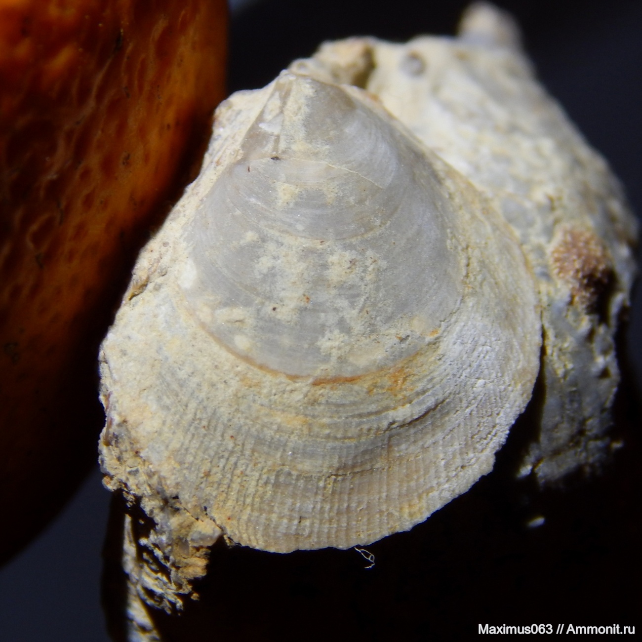 В новогодние каникулы, при разборе осенних находок, были обнаружены мшанка и раковина двустворчатого моллюска, прикрепленная к брахиоподе Aulosteges horrescens. Размер двустворки 17*14*5 мм. Пересмотрел труд С.В.Попов, И.А.Гончарова, А.В.Гужов «Двустворчатые моллюски России и сопредельных стран в фанерозое», но похожей двустворки не нашел. Обратился за помощью к Шамаеву Роману Юрьевичу ( Calypso ). Спасибо Роман за помощь! Совместными усилиями мы, к сожалению, ничего более-менее вразумительного не нашли ни в литературе, ни на Аммонит.ру. Предварительное определение Aviculopecten sp.. Буду рад помощи в определении. Фотографии делались для дальнейшей обработки в фотошоп, но понравилось сочетание цвета и света. Решил оставить как есть.