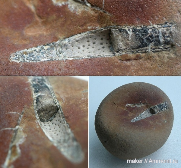 Сантиметров 5 в диаметре, видимо сидеритовая конкреция. В ней фрагмент чего-то. Я бы сказал игла, но смушает пустотелость (заполнена породой) и несколько внешних оболочек.