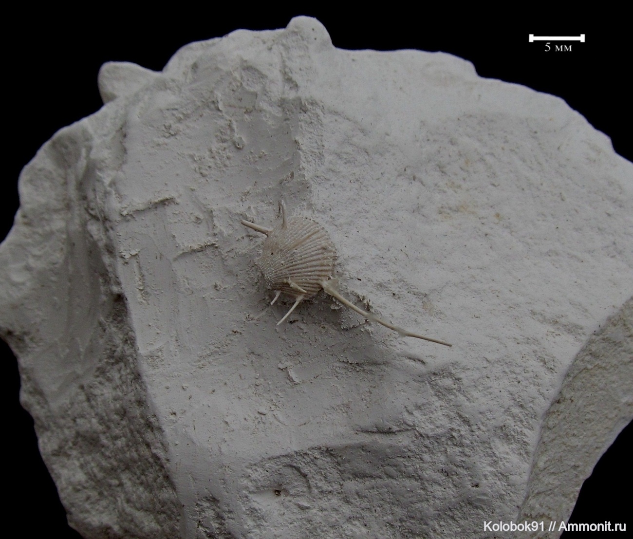 Длина раковины 0.7 см. Длина большого шипа 1.6 см. Извиняюсь за кривую склейку, уж очень он тонкий.