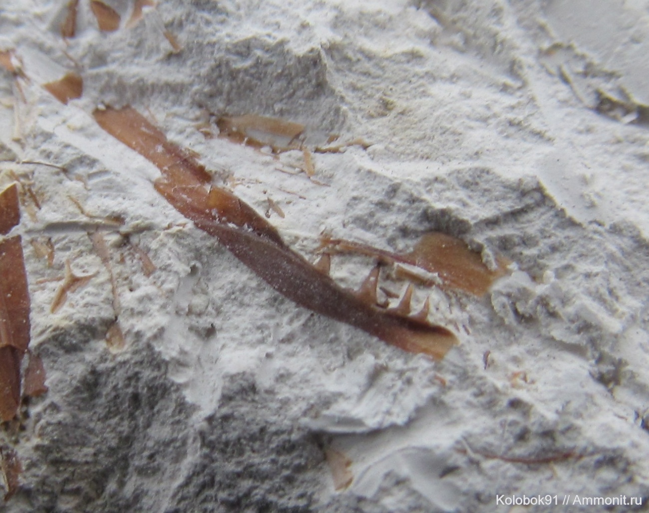 Красота однако! Классная находка! Правда, по фото и не скажешь, что и фрагмент не большой и зубки не великаны. Смотрятся как от большой рыбехи :) | ||||||