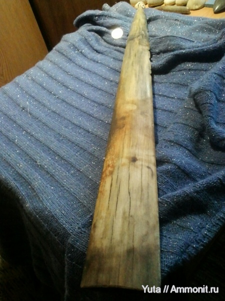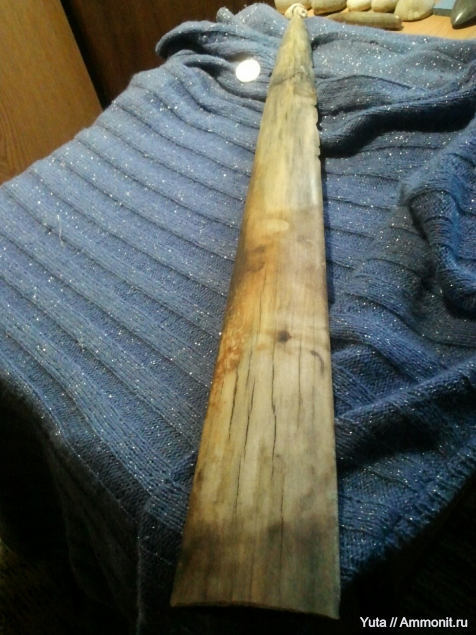 Оканемелая кость,острая с двух сторон, внешне напоминает мечь,по весу и внешнему виду это камень (потому что она тяжелая,если по ней постучать то звук как будто бы бъешь по металлу.Найдена была год назад на горном озере, на высоте трехсот метров, летом,когда озеро омелело из за сильной жары,оно торчало из берега,есть предположение что это бивень от кит Odobenocetops из плиоцена.Помогите классифицировать эту оканемелую находку.