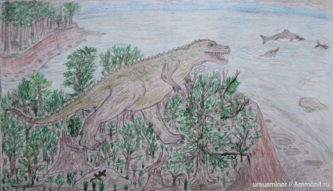 Я решил нарисовать этого динозавра. Он в окружении голосеменных деревьев и кустов. В море ихтиозавры. О том, что в это время там были голосеменные, свидетельствуют находки шишек и гагата: