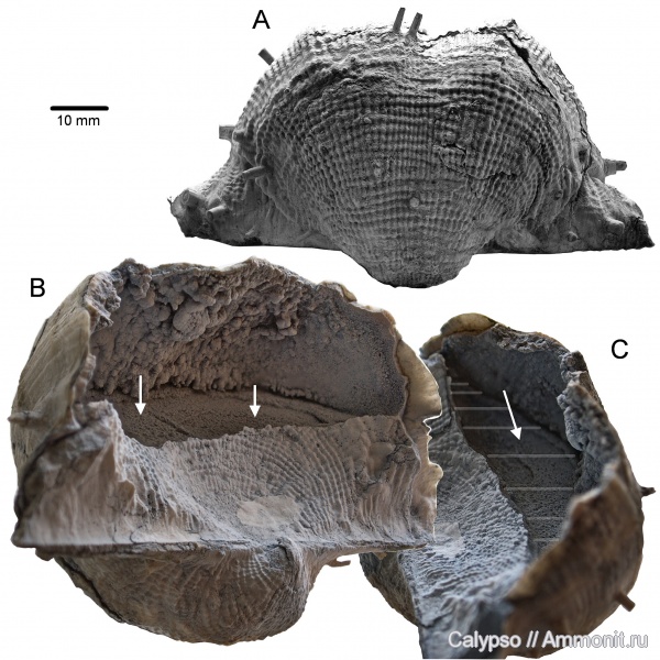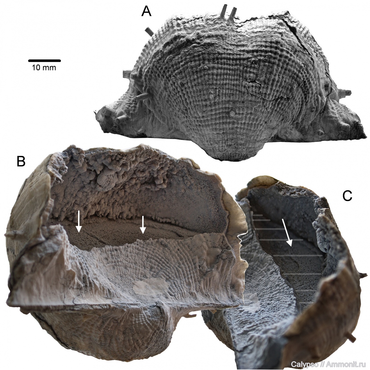 Здесь мы также можем наблюдать через скол раковины (спинной створки) в обширной висцеральной полости горизонтальную площадку-осадок. В моём случае плоскость площадки почти параллельна заднему смычному краю. Если гипотетически раковину разместить так, чтобы уровень площадки совпадал с уровнем горизонта, то раковина оказывается в положении близко к прижизненному, т.е. обычно для большинства "ретикулятных" продуктид брюшной створкой вниз и с приподнятым шлейфом. Это указывает на то, что захоронение произошло на месте, без переноса. Фигуры B и C показывают наглядно такое положение, близкое к прижизненному. Штриховкой на фиг. C я обозначил ориентировку площадки относительно уровня горизонта. Фигура A - общий вид раковины (напылёна хлористым аммонием) со стороны заднего смычного края.