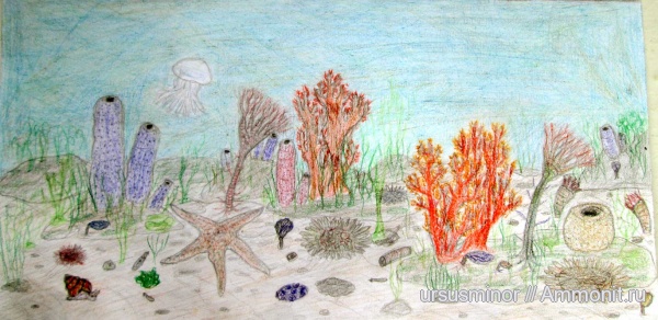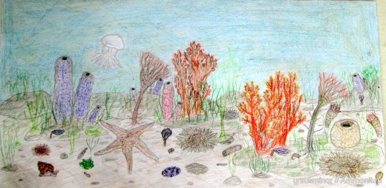 Мой рисунок оксфордского дна окрестностей Нового Света и Судака . На дне морские ежи, звезда, лилии, кораллы, губки, брахиоподы и гастропода. Карандаши, бумага.