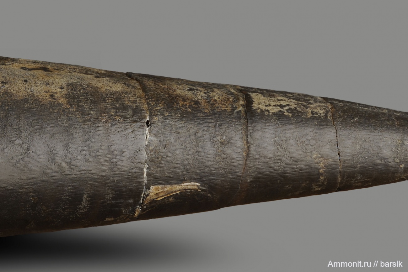 Пересматривал коллекцию белемнитов и готовился совсем по другой теме и вот на крупном ростре Megateuthis cf. suevica (Klein, 1773) из верхнего байоса при определенном угле наклона четко проступила структура в спиной части у острия. Находке уже несколько лет, она представлена на сайте аж 2009 году, но вот только сейчас и рассмотрел эту мелко-зернистую структуру.