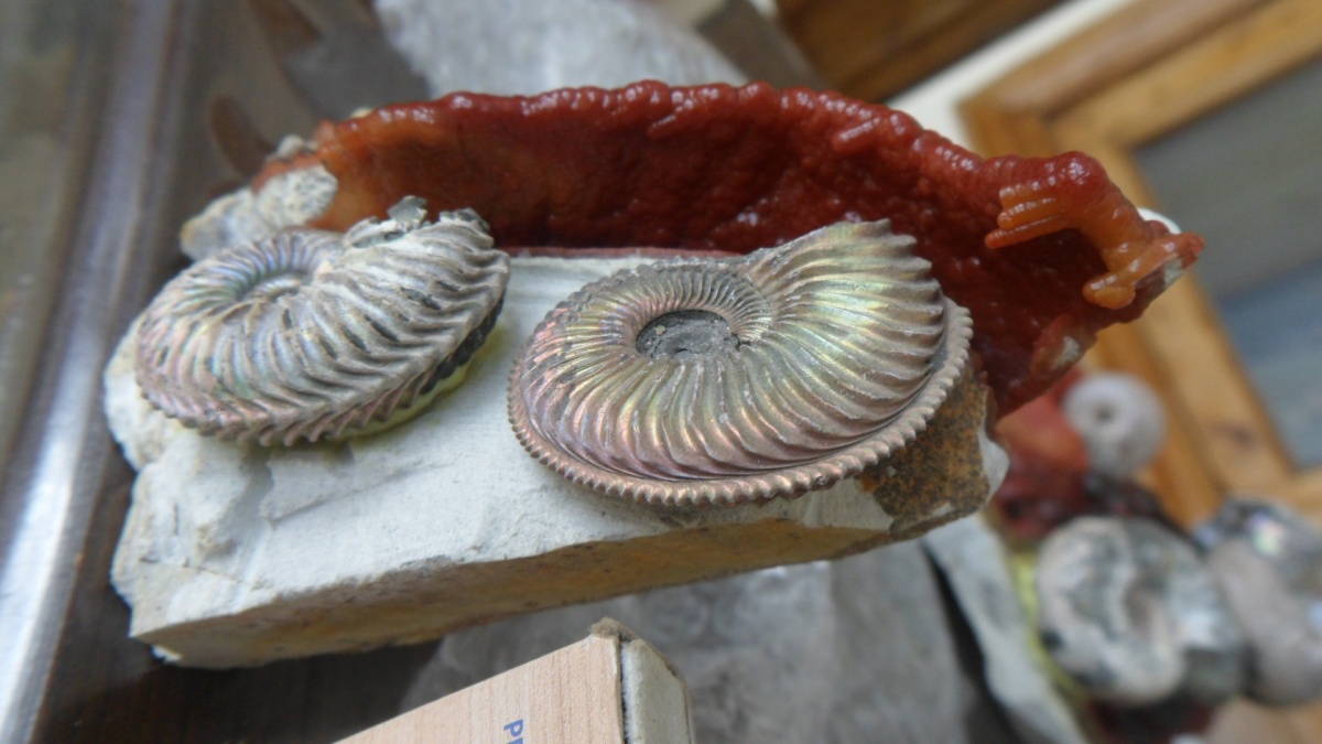 Хороший подарок! Но это верхняя юра, оксфордский ярус, в келловее таких еще не было. На основном фото внизу Cardioceras из Михайлова, он потолще (нижний оксфорд), а вверху его потомок Amoeboceras из Бронниц, он тоньше, с более высоким килем (верхний оксфорд). | ||||||