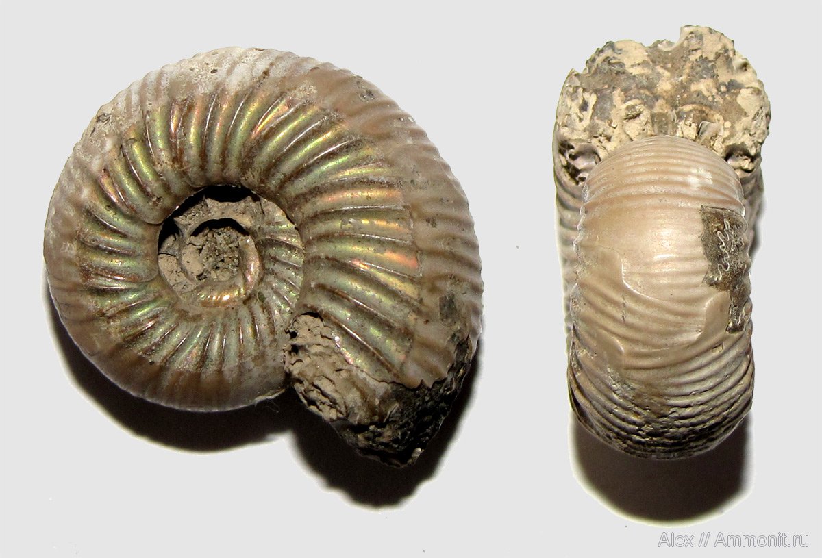 Небольшой перламутровый аммонит, относящийся к семейству Perisphinctidae. Диаметр раковины 2,3 см. На вентральной стороне видны характерные для многих перисфинктид выступы-"параболы". Причем у этого аммонита есть все эти "параболы" нормальные - парные, но в одном месте на раковине в результате какого-то сбоя аммонит построил сразу 3 "параболы" (это видно на фото).