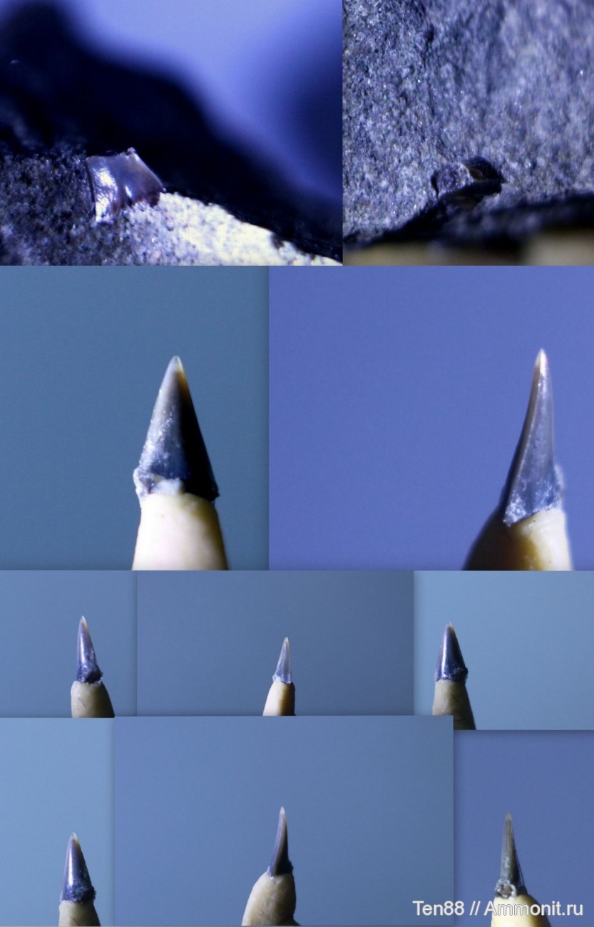 Надеюсь, что с определением не ошиблась :). При извлечении аммонита была чисто случайно обнаружена часть зуба (верхнее фото) все-то 1 мм. А вот саму коронку уже увидела, когда собиралась выбрасывать остатки породы. Пока не склеила, т.к. помню, что мне советовали сначала все фотографировать, а потом клеить. Примерно приложила все сошлось. Но вот надо аккуратненько это дело склеить, а это надо сосредоточиться :), т.к. сама короночка почти 4 мм.